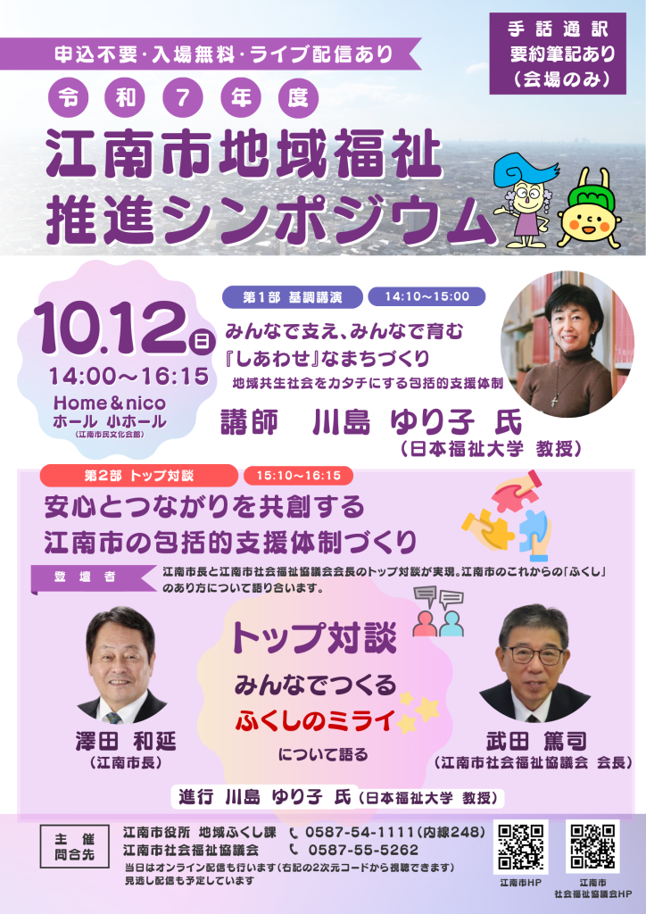 令和7年10月12日(日)Home&nicoホールにて、「第16回ふくし江南ふれあいまつり」を開催しますが、会場同じく、Home&nicoホール小ホール、14:00~、「令和7年度江南市地域福祉推進シンポジウム」を開催します。今回は日本福祉大学教授の川島ゆり子氏による基調講演、第2部にはトップ対談として、江南市長×江南市社会福祉協議会会長の対談が実現します。