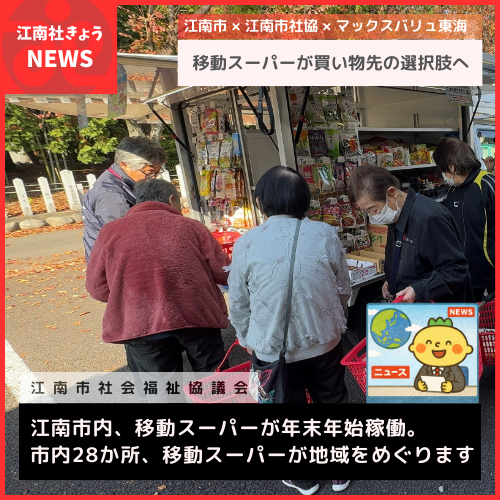 江南市と江南市社会福祉協議会では令和6年度に地域のことを話し合う場「地域福祉懇談会」を開催し、江南市の課題として「買い物」について話し合いを地域住民と重ねてきました。地域の声を取りまとめ、今回、江南市×社協×マックスバリュ東海と協定を締結し、移動スーパー事業を令和7年11月27日(水)より実施することに至りました。年末年始も休まず稼働。ありがとうございます。