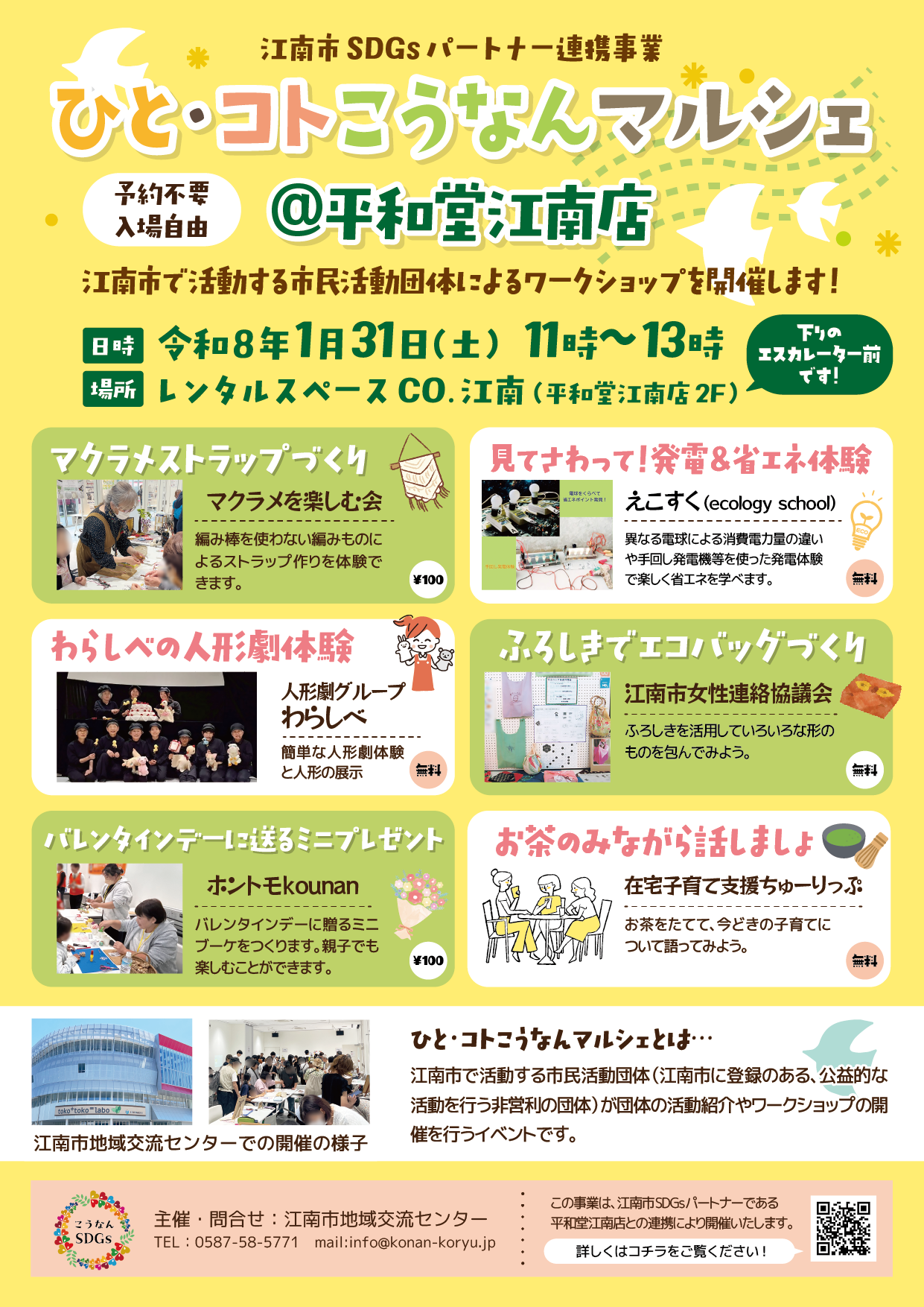 なお、令和8年1月31日には江南市SDGsパートナー連携事業として「ひと・コトこうなんマルシェ@平和堂江南店」が開催予定です。ぜひ会場を見たことがない方やこれから利用したいと考えている地域活動団体等、参加していただければとおもいまs