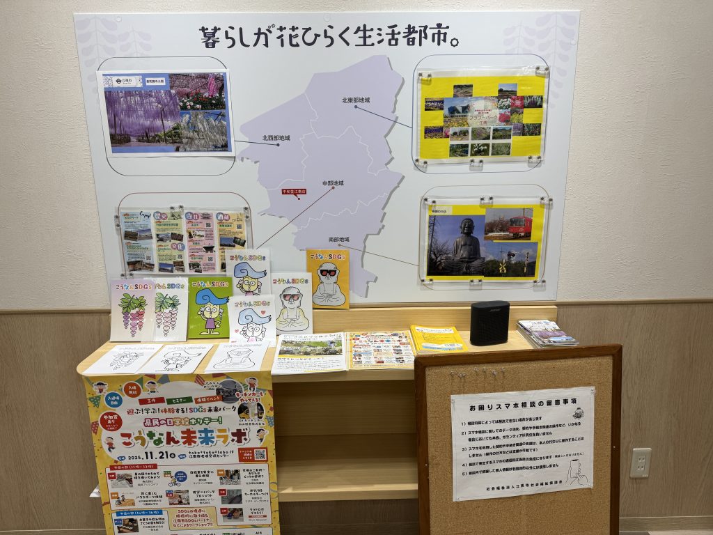 江南市内の地域情報が把握できるマップもあり、江南市のことを理解できるコーナーになっています。江南市社会福祉協議会として会場を活用して、出張お困りスマホ相談や子どもの居場所づくり等に協力しながら、企業と連携した地域活動の拠点づくりを支援しています。
