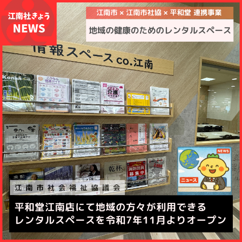 令和7年11月、令和江南市上奈良町にある「平和堂江南店」の2階に地域住民が利用できるレンタルスペース「レンタルスペースco.江南」が誕生しました。この取り組みは江南市SDGsパートナー連携に基づき、平和堂江南店の「地域の健康を考えたい」という目的の基、平和堂×江南市×江南市社会福祉協議会の3者で話し合いを重ねて拠点が生まれました。