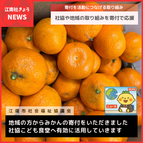 ボランティア みかんの寄付をこども食堂へ 2026.01.15 江南市社会福祉協議会では寄付を受け入れており必要な支援へとつなげています。今回はみかんの寄付をいただき、1月開催の社協こども食堂で活用する予定です。 ボランティア 江南市SDGsパートナー連携事業(平和堂×江南市) ふれあい・いきいきサロン交流・研修会を開催