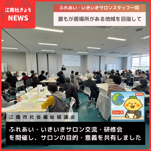 生活支援コーディネーター ふれあい・いきいきサロン交流・研修会を開催 2026.01.19 本日は「ふれあい・いきいきサロン」を運営するスタッフを対象に「ふれあい・いきいきサロン交流・研修会」を開催しました。今回の目的は、①サロンの目的と意義の共有、②困ったときにサロンで抱え込まないような体制づくりを目的に開催しました。 ▲研修会の中には事例を通じて、自分たちのサロンでどのような対応が大切かをグループワークを通じて学びました 生活支援コーディネーター みかんの寄付をこども食堂へ 介助犬教室を江南市内で開催