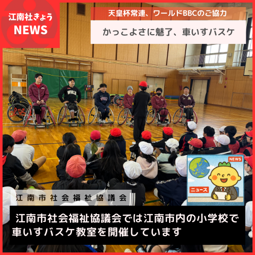 江南市社会福祉協議会では「ワールドBBC」と協力して市内小学校を対象に「車いすバスケ教室」を開催しています。ワールドBBCは愛知県名古屋市を拠点に活動する車いすバスケットボールチームです。ワールドBBCと江南市社会福祉協議会は20年以上も継続して活動しています。