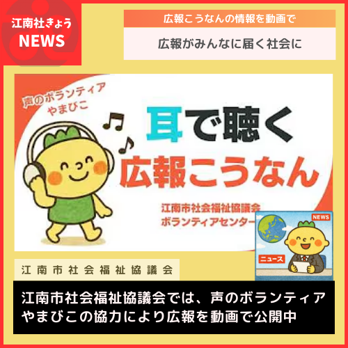 江南市社会福祉協議会の登録ボランティアグループ「声のボランティアやまびこ」は広報こうなんや社協だよりを読んでいる声を録音・編集、CDやデータにして視覚障がい者に届けるボランティア活動を行っています。令和7年度からは市や社協、図書館の窓口でのCD貸出の他、YouTubeでの音声データの動画配信を試験的に実施しています。