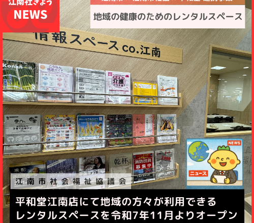 平和堂江南店 地域への取り組み 令和7年11月、令和江南市上奈良町にある「平和堂江南店」の2階に地域住民が利用できるレンタルスペース「レンタルスペースco.江南」が誕生しました。こ... 生活支援コーディネーター 2026.01.07