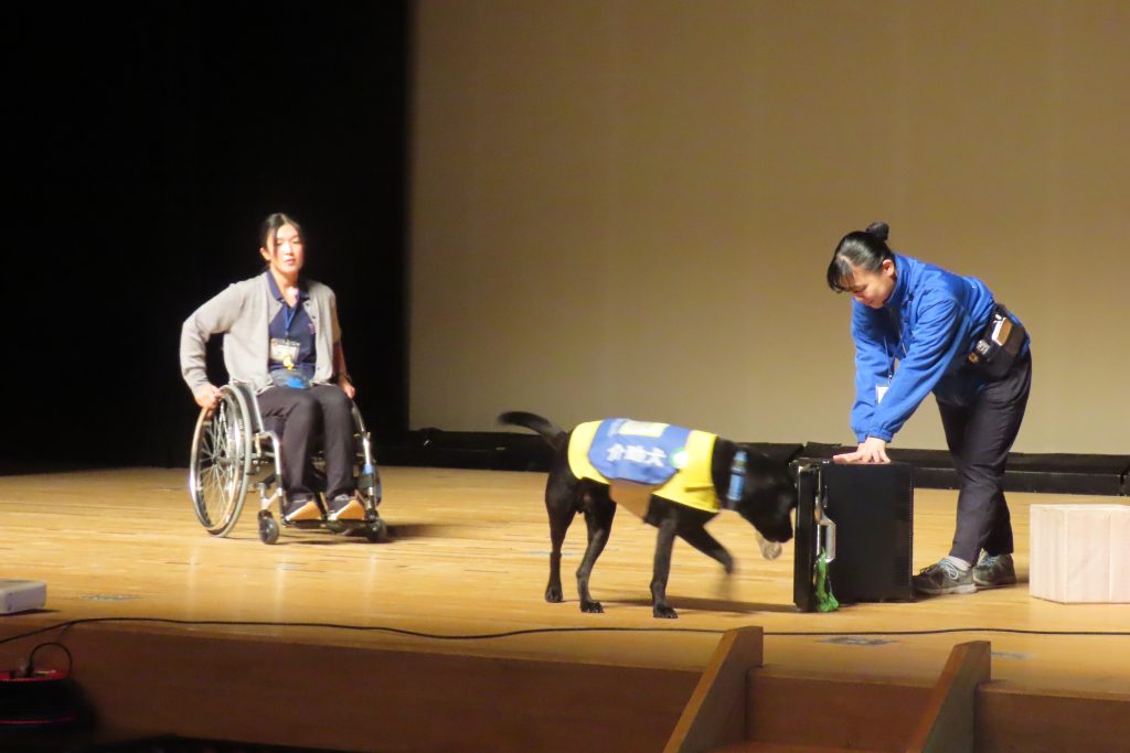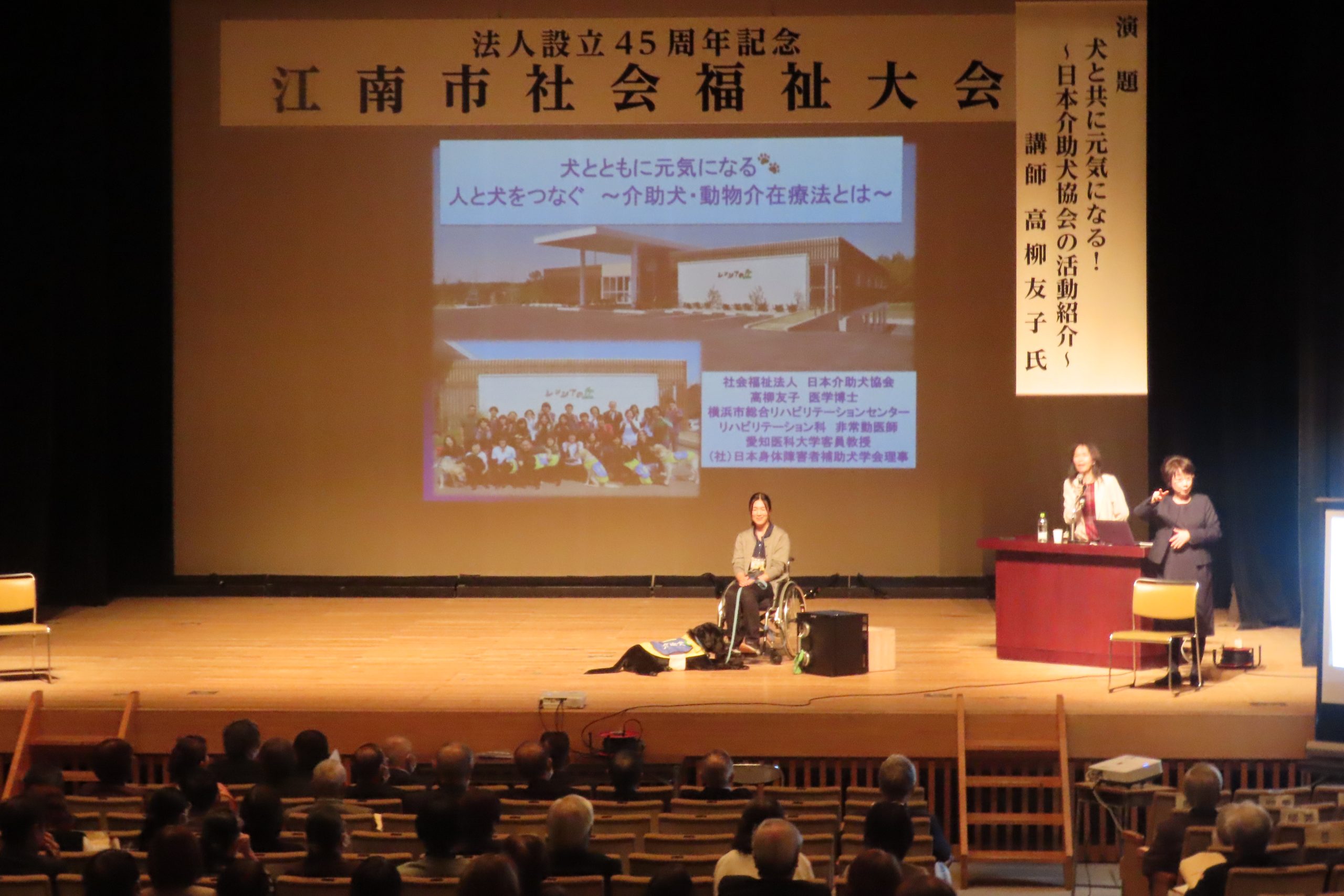 式典終了後の記念講演では、社会福祉法人日本介助犬協会の理事長 高柳友子様をお招きし「犬と共に元気になる!日本介助犬協会の活動紹介」と題してご講演をいただきました。講演では「身体障害者補助犬の正しい理解」や「介助犬使用者の介助犬との暮らし」について、デモンストレーションや動画を交えて紹介されました。支える側・支えられる側という枠を超えた「共に生きる視点」の大切さや地域共生社会の実現に向けたヒントとなる内容をお話しいただき、会場からは大きな拍手がありました。