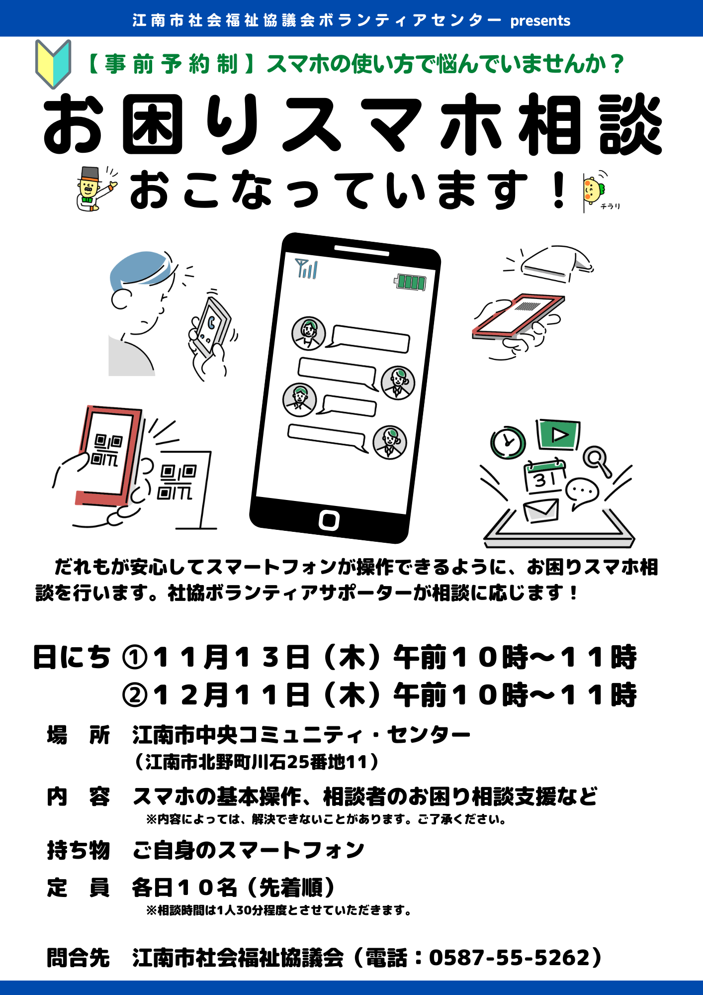 講座・イベント お困りスマホ相談を実施します 2025.09.25 申込は、令和7年10月1日(水)午前9時から開始 申込方法① 江南市社会福祉協議会へ電話 (0587-55-5262) 申込方法② 下記のボタン(WEBフォーム)から申し込む 申込はこちらから 聞こえのサポーター教室を開催します