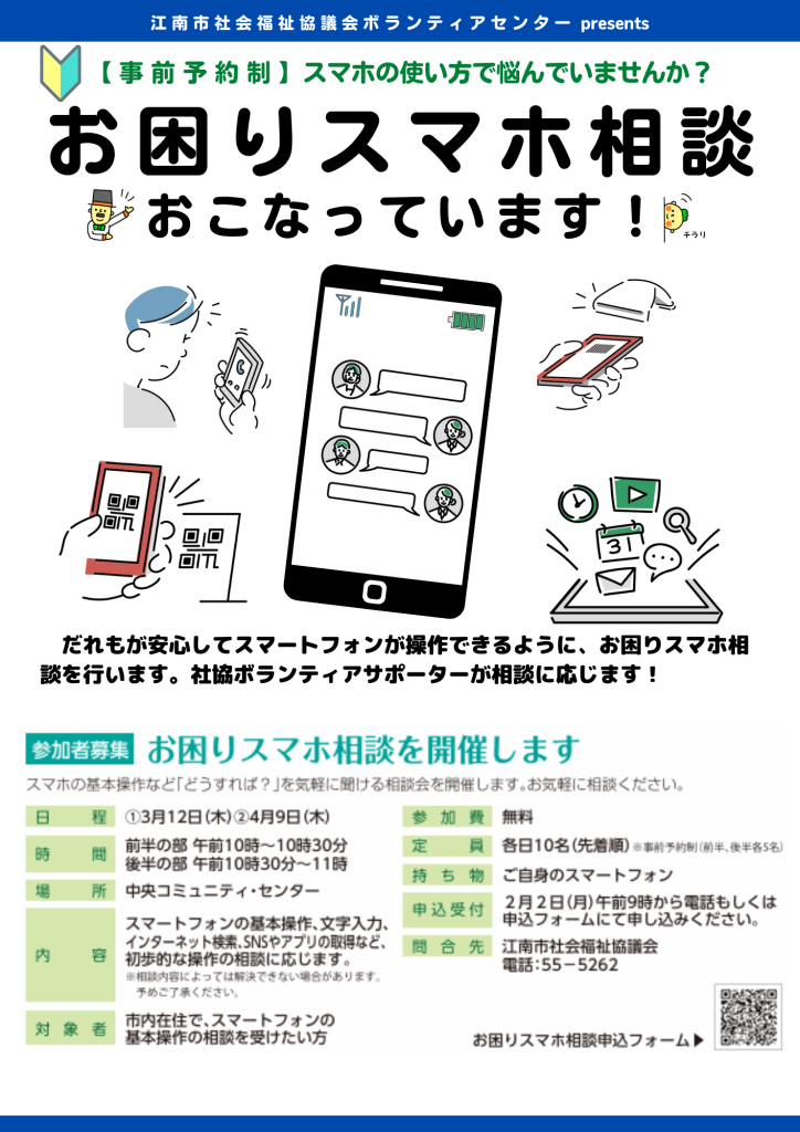 講座・イベント お困りスマホ相談を実施します 2026.01.26 申込は、令和8年2月2日(月)午前9時から開始 申込方法① 江南市社会福祉協議会へ電話 (0587-55-5262) 申込方法② 下記のボタン(WEBフォーム)から申込む 申込はこちらから ボランティア手話講座を開催します! ボランティアマルシェを開催します!