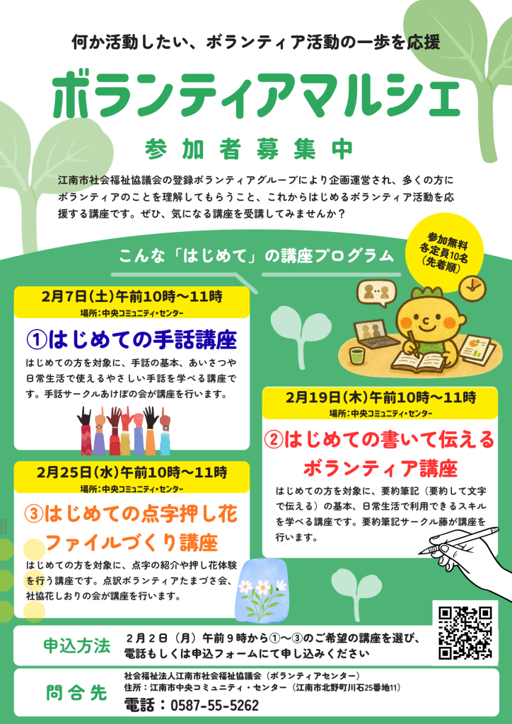 講座・イベント ボランティアマルシェを開催します! 2026.01.26 申込は、令和8年2月2日(月)午前9時から開始 申込方法① 江南市社会福祉協議会へ電話 (0587-55-5262) 申込方法② 下記のボタン(WEBフォーム)から申込む 申込はこちらから お困りスマホ相談を実施します スマホ教室~地図アプリの操作・生成AIを使ってみよう...