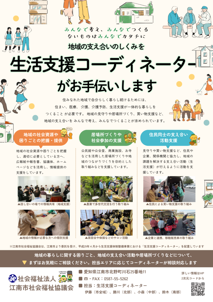 高齢な方の生活支援・介護予防サービスの体制整備を推進をしていくことを目的とした職員(生活支援コーディネーター)を江南市社会福祉協議会が市より委託を受け配置しています。生活支援コーディネーターを市全域(第1層)に1名、地域包括支援センター圏域(第2層)に3名配置しています。
