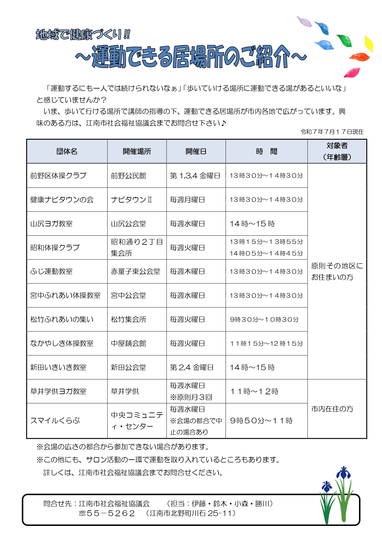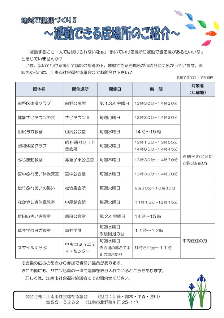 地域住民が運営し、体操の講師に協力いただきながら体操やヨガ等の「健康づくりの居場所」を目的とした居場所も多くあります。