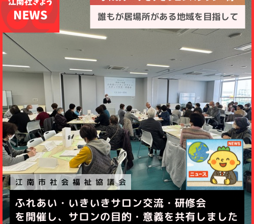 本日は「ふれあい・いきいきサロン」を運営するスタッフを対象に「ふれあい・いきいきサロン交流・研修会」を開催しました。今回の目的は、①サロンの目的と意...